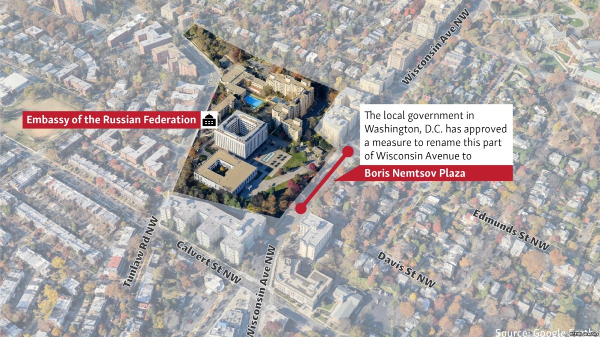 Mail to the Russian embassy in Washington may soon have to be addressed to ‘1 Boris Nemtsov Plaza’. No, Russia’s diplomatic mission to the U.S. isn’t moving from its current location on Wisconsin Avenue.