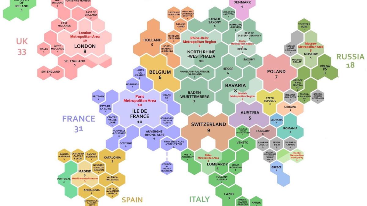 The worldwide overview clearly shows which three regions are the world’s economic powerhouses. Despite the rise of East Asia (265 hexagons), North America (282) is still number one, with Europe (250) placing a close third. Added up, that’s just three hexagons shy of 80 percent of the world’s GDP. The remaining one-fifth of the world’s economy is spread — rather thinly, by necessity — across Southeast Asia & Oceania (56), South Asia (41), the Middle East (38), South America (32), Africa (27), and North & Central Asia (9).