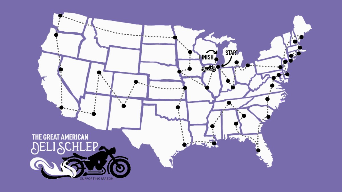 Enter the Jewish Motorcycle Alliance, an organization whose chapters have names like “Kosher Hogs,” “Hillel’s Angels,” and “Shalom and Chrome.” Steve Goode, a resident of Deerfield, Illinois and a JMA member, has a penchant for long, themed rides. In the years since his retirement in 2012, he had gone on three major bike trips: visiting all of America’s national parks, each of the 48 contiguous states, and the country’s four “corners.”