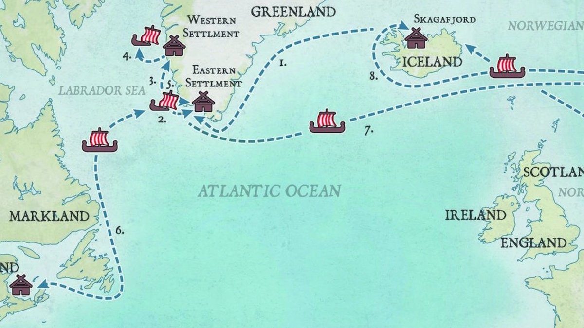 Gudrid then settles in Greenland (#3) and eventually marries Thorstein Erikson, brother of Leif and son of Erik. Leif has just returned from a strange new land he discovered across the ocean, and according to one saga, Gudrid joins Thorstein on an unsuccessful trip over to the other side (#4).
