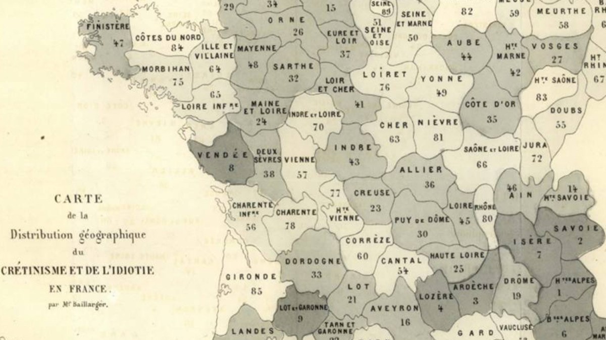 Map of the geographic distribution of ‘cretinism and idiocy in France’. White: less than 2 ‘cretins or idiots’ per 1,000 inhabitants. Lightest grey: at least two. Middle shade: at least three. Darkest grey: at least five.