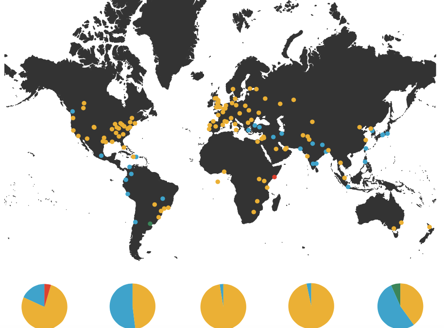 Interestingly, these groups are distributed unevenly throughout the world. Group 3 totally dominates North America (all cities except Vancouver) and Europe (everywhere except Athens), but is challenged more in other parts of the world.