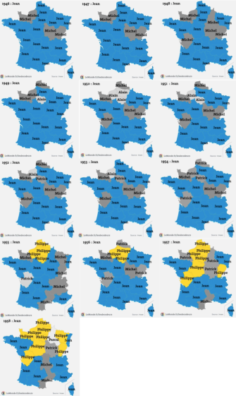 It’s 1946, and France has won the Second World War (with some help from its allies). The nation is grateful to its liberator, général de Gaulle. But that doesn’t mean mothers start naming their baby boys Charles after him. That kind of thing won’t come into fashion for some years yet. For now, the most popular boys’ name in France is Jean. As it is in most other Christian countries. As it has been, probably since the Middle Ages (1).