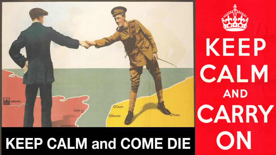As it turns out, the now-famous exhortation has an equally phlegmatic antecedent. One world war earlier, another poster cheerily asked the common Britlander to do his duty — again carefully sidestepping all the blood and gore involved.