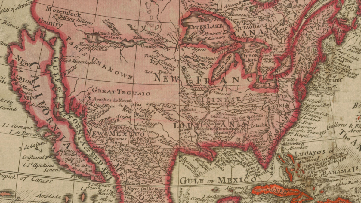 Detail of a map by Richard William Seale, created in London in 1745. While the East Coast is shaping up with names and borders still recognisable today, the West Coast is still dominated by that huge, floating island – rendered in great detail for added believability.