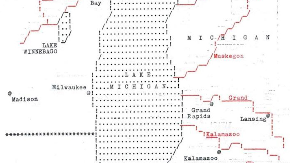 City and river names are in lower case, state and lake names are in upper case. The rivers, made up of straight and slanted lines, and their names are in red (yes, kids: typewriters could do two colours). Where it doesn’t slant, the water’s edge is rendered by exclamation marks – adding emphasis to the name of Beaver! Island! in the northern part of the lake.