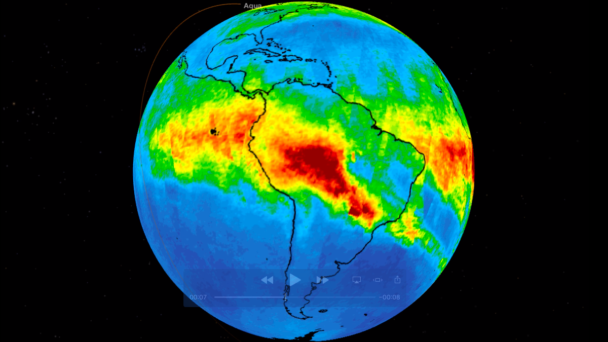 As the clip shows, the CO plume rises in the northwest part of the Amazon, a massive region covering Brazil’s western half. First it drifts further northwest, towards the Pacific Ocean; then, in a more concentrated plume, towards Brazil’s southeast.