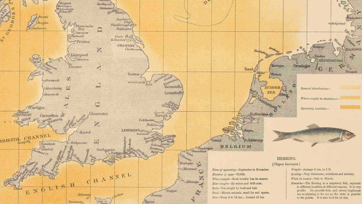 But the atlas does more than be clever and look cool. It’s also a window into a world that’s now destroyed and forgotten: one in which the North Sea – the body of water between the British east coast and the European mainland – teemed with life. Published in 1883, the atlas devotes one map each to 40-odd species of fish and crustaceans, describing their habits and habitats, and how and when to catch them. Less than a century and a half later, all are now greatly reduced, and some are functionally extinct in the North Sea.