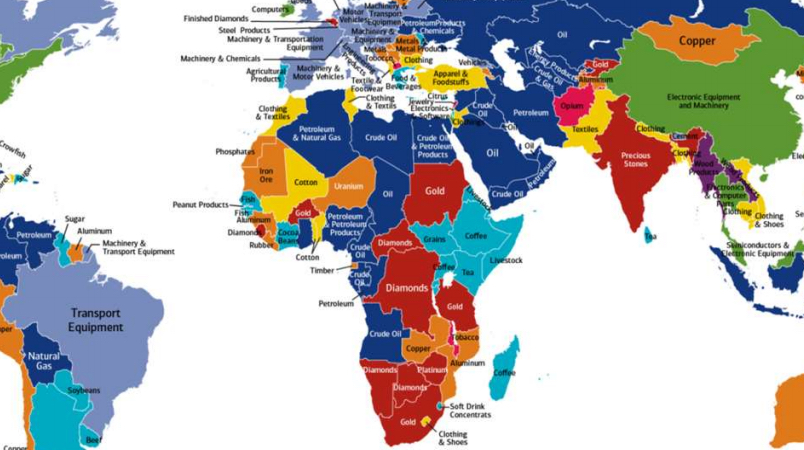 What makes the world go round? Not love or money. Except if it’s the love of oil, and the money to pay for it. This world map shows each country’s main export, excluding services. The results are colour-coded. The map is dominated by blue.