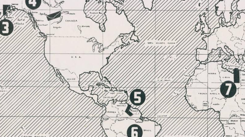 4. CANADA: Area west of Aklavik in lower Mackenzie River valley & small segment of north Alaska. Air & sea outpost astride Arctic Circle. Tough pioneering country. 24-hour sunlight in summer; long, dark, cold winter. Rich, jungle-like plant & vegetable life, huge animal herds, giant timber. Uninhabited. ALTERNATE: Peace River Block, landlocked in Br. Columbia. Pleasant, livable, empty. Rich soil. Many natural resources.