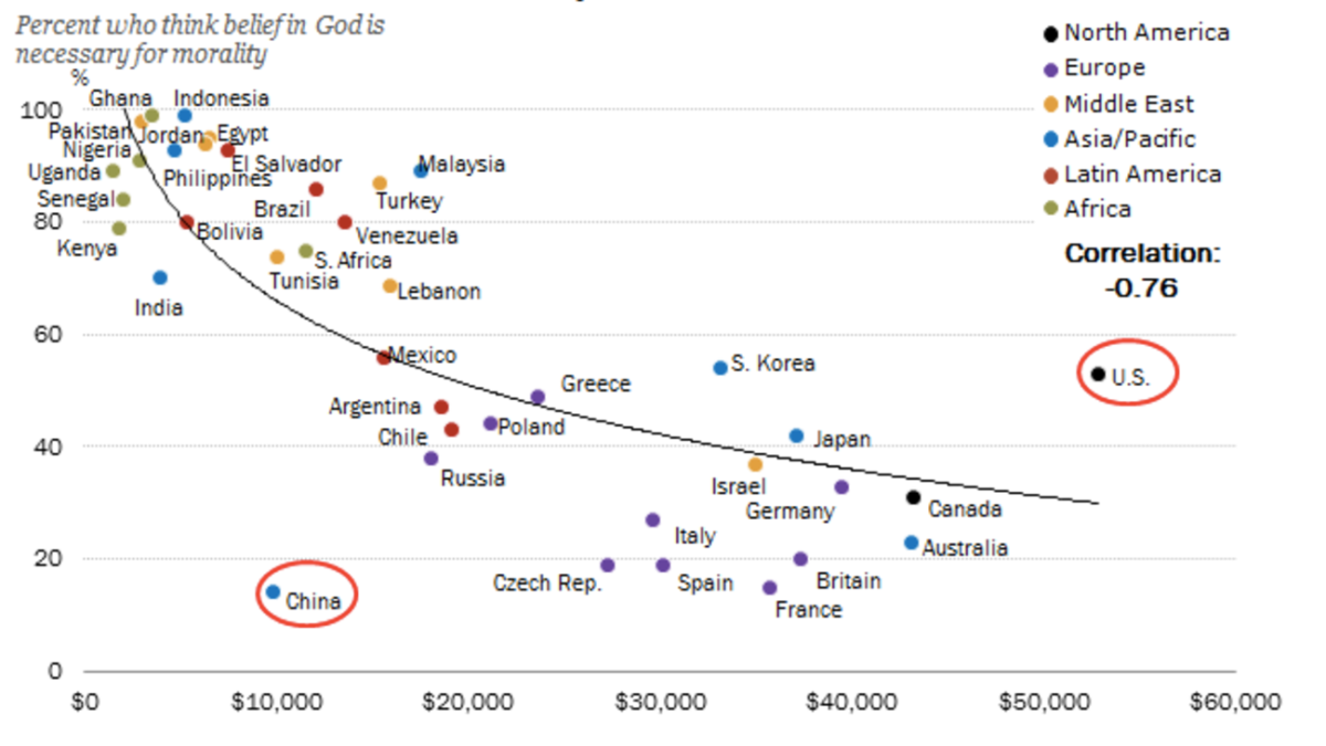 And China, relatively poor, is atypically areligious. The average per capita GDP is almost exactly $10,000, which would imply a piety score of close to 70 percent. In fact, the score is just over 10 percent, the lowest of all countries shown, ex aequo with France, equally areligious, but much richer.
