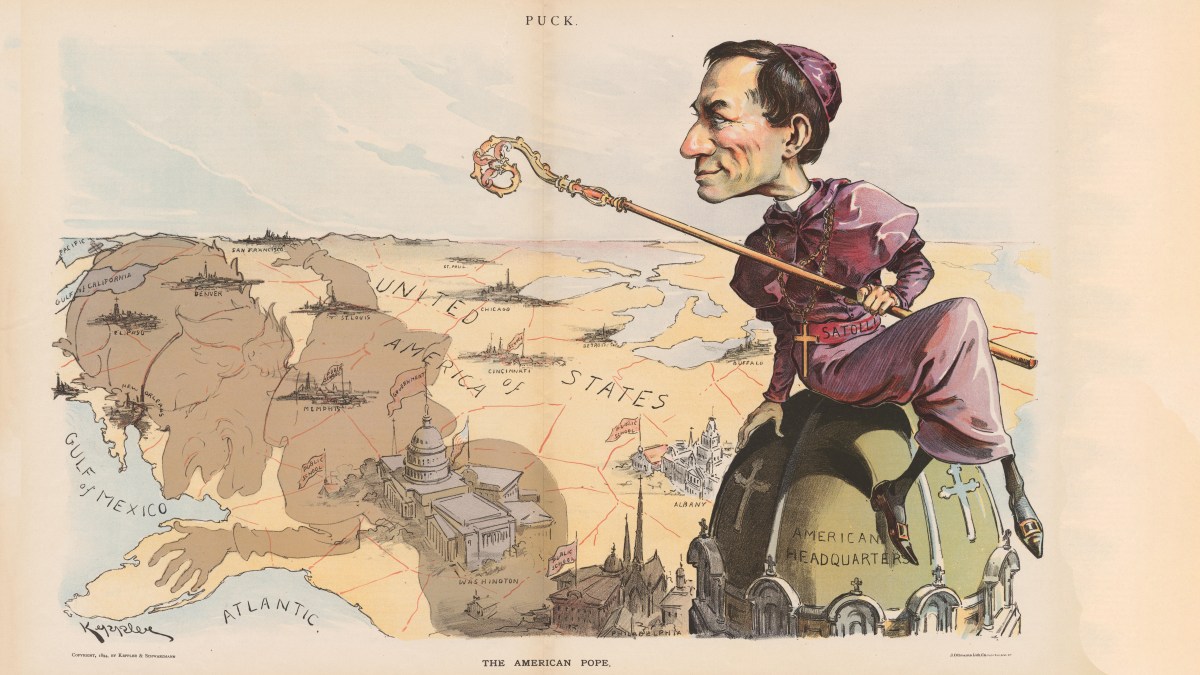 The cardinal casting his shadow over America is Francesco Satolli, appointed in 1893 as the first Papal Nuncio to the United States. In certain circles, that appointment raised fears that he would meddle in American domestic affairs, especially concerning education (hence all the “public school” flags fluttering in Satolli’s shadow).