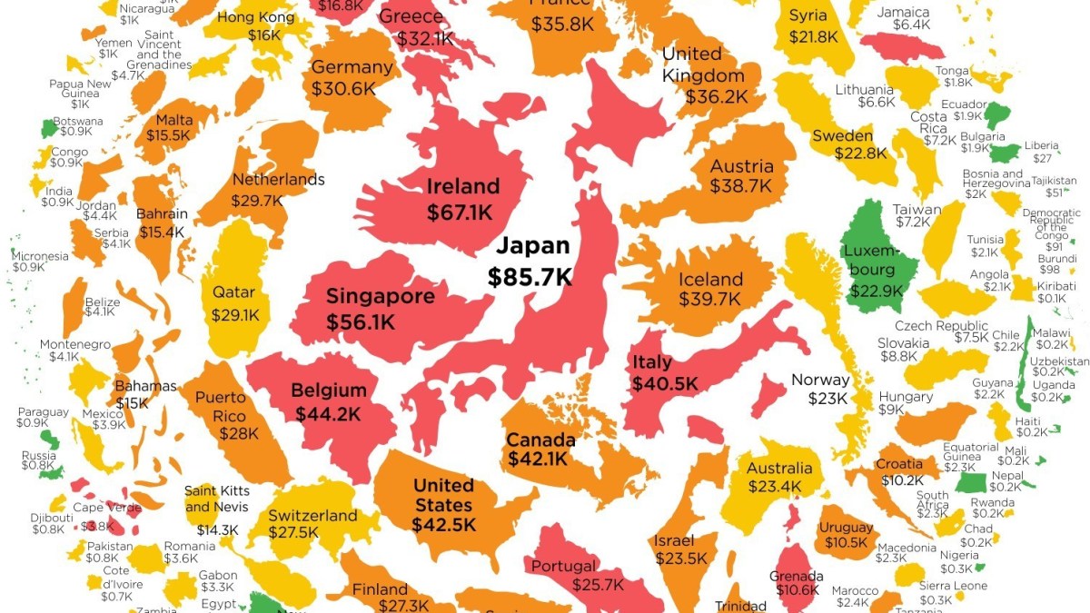 The clue is in the dollar amount under each country name: that is how much each citizen owes as a share of their nation’s debt. The bigger that figure, the bigger the country on this pizza. This is what the top ten looks like: