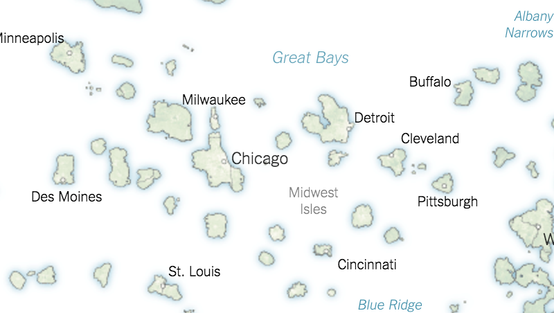 Showing the two sides each as separate island nations captures the sense of alienation and distance between both. The existence of the other is negated, submerged, reduced to lapping waves. On the Trumpistan map, pro-Hillary counties coalesce into nothing more than bodies of water: Las Vegas Harbor, the Santa Fe Sea, Des Moines Pond, the New York Narrows and the D.C. Delta. A similar nomenclature on the Clintonesia map shows the Wyoming Shallows, the High Plains Sea and the Great Bays (bye bye, Michigan). Not so much rival territory as another realm. Democratic islands in a conservative sea include Albuquerque Island, the Montana Archipelago and Isla Grande, in the south of Texas.
