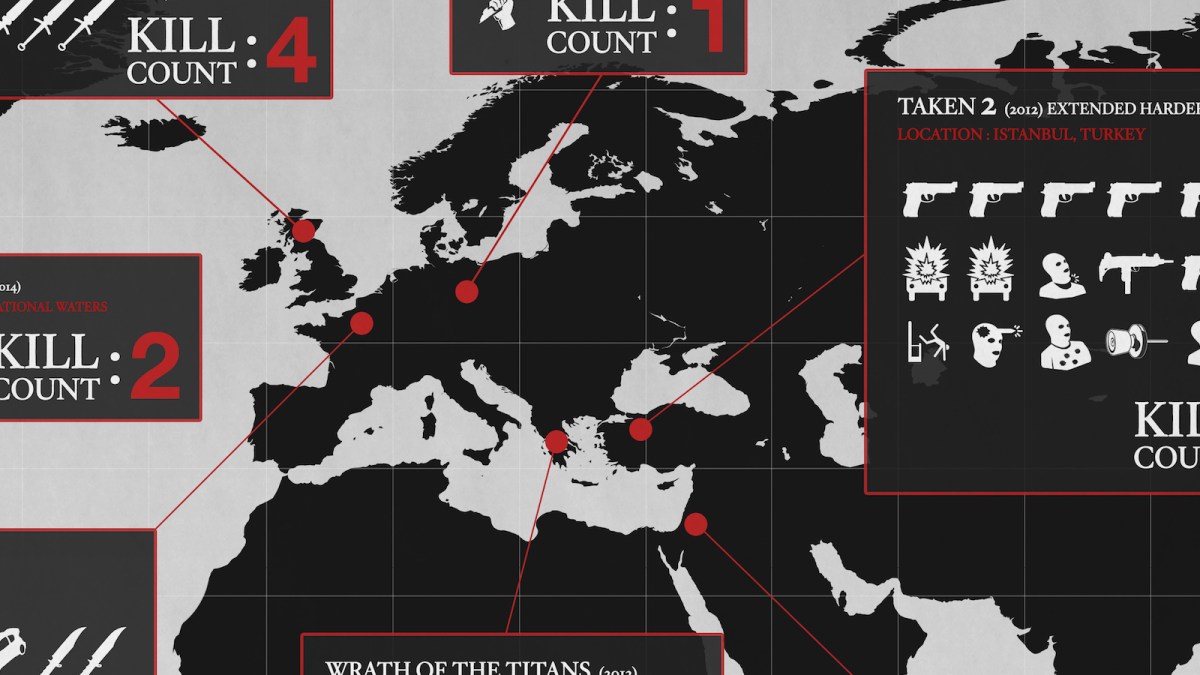 That’s the theory behind this Liam Neeson Kill Map, which charts the 115 lives snuffed out, across 16 movies, by the Irish actor.