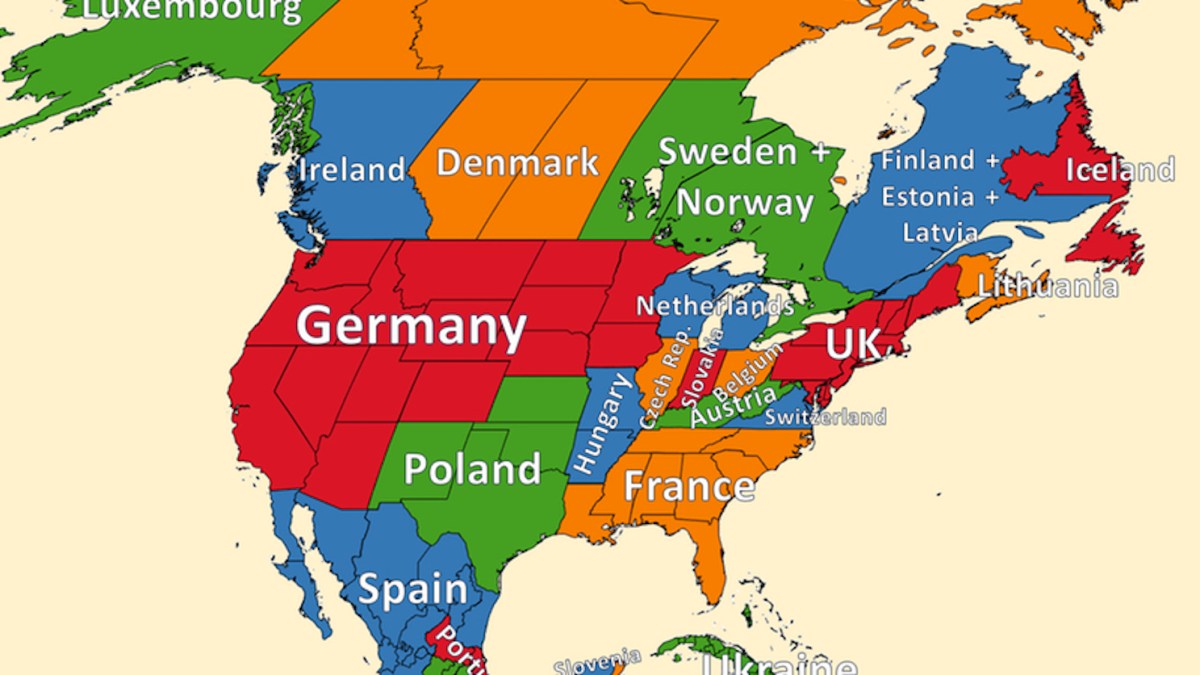 The Netherlands also absorb two states: Wisconsin (6 million) and Michigan (10 million). The UK, appropriately, occupies the six New England states (Maine, Vermont, New Hampshire, Massachusetts, Rhode Island, Connecticut), plus New York, Pennsylvania, New Jersey, Maryland and Delaware.