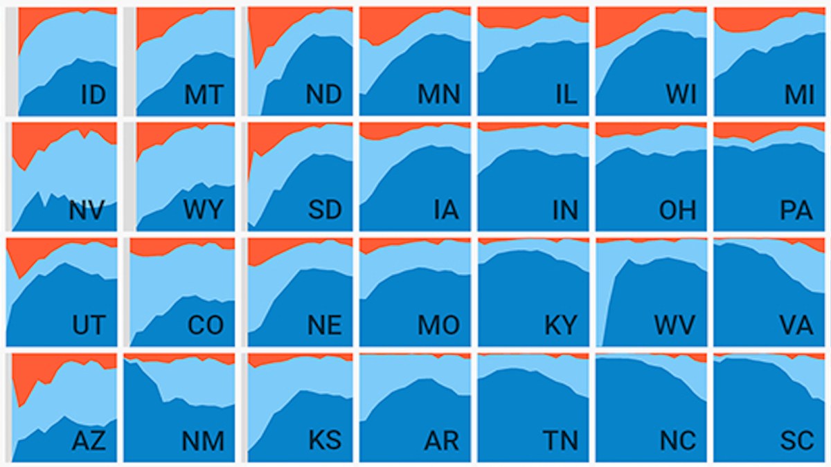 As you witness those shares in each state evolve over time (i.e. from left to right), the composite picture of those 50 states together immediately illuminates trends and outliers, both nationally and regionally.