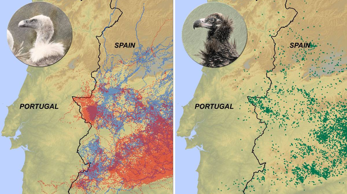 In fact, both tracking maps are pretty good at revealing exactly where the Spanish-Portuguese border is. How’s that? No, vultures have no concept of political geography. And the climate, topography, and ecosystems on either side of the border are pretty much the same.