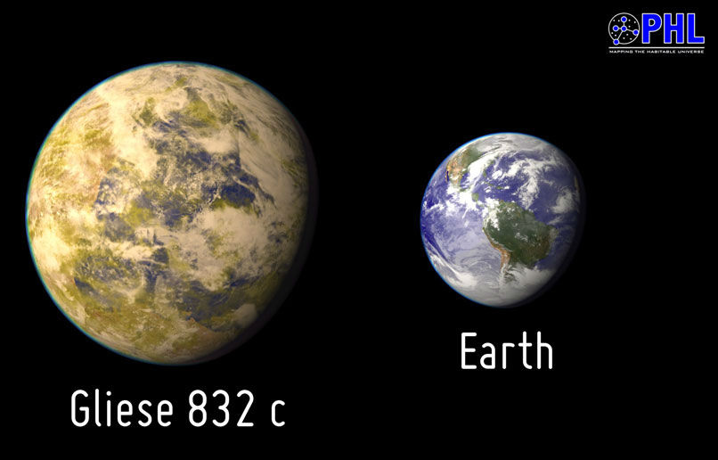 This planet is only 16 light years away — could it harbor life? Recently discovered exoplanetGliese 832c has been found in a close orbit around a star that is less bright than our Sun. An interesting coincidence, however, is that Gliese 832c receives just about the same average energy from its parent star as does the Earth. Since the planet was discovered only by a slight wobble in its parent star‘s motion, the above illustration is just an artistic guess of the planet’s appearance — much remains unknown about Gliese 832c’s true mass, size, and atmosphere. If Gliese 832c has an atmosphere like Earth, it may be a super-Earth undergoing strong seasons but capable of supporting life. Alternatively, if Gliese 832c has a thick atmosphere like Venus, it may be a super-Venus and so unlikely to support life as we know it. The close 16-light year distance makes the Gliese 832 planetary system currently the nearest to Earth that could potentially support life. The proximity of the Gliese 832 system therefore lends itself to more detailed future examination and, in the most spectacularly optimistic scenario, actual communication — were intelligent life found there.