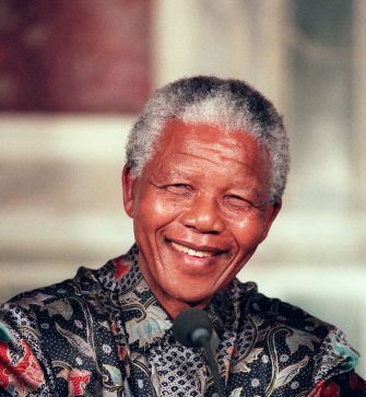 South African President Nelson Mandela smiles 16 July 1966 in Paris as he answers journalists’ questions during his official visit to France. (Photo credit should read PIERRE VERDY/AFP/Getty Images)