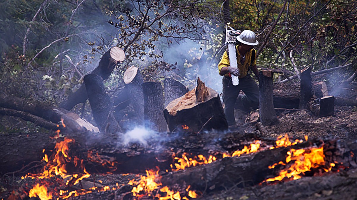 Photo MIDDLETOWN, CA – SEPTEMBER 15: A sawyer climbs a hillside while cutting down trees that burned in the Valley Fire on September 15, 2015 in Middletown, California. The 104-square-mile fire destroyed 585 homes and hundreds of other structures. (Photo by David McNew/Getty Images)