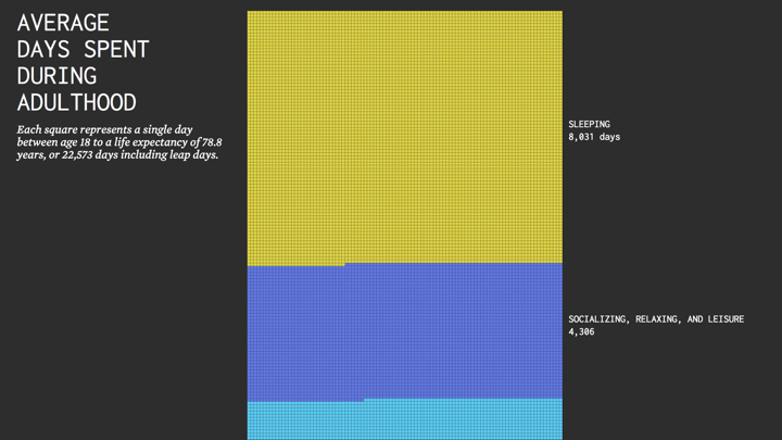 Yau is showing averages — for example, someone with kids has a slightly different allocation of activities — so most people’s actual time spent will be a little different than the mean shown here. And the visualization also assumes a person works through their adult life and then retires at 65, which may or may not be true for you.