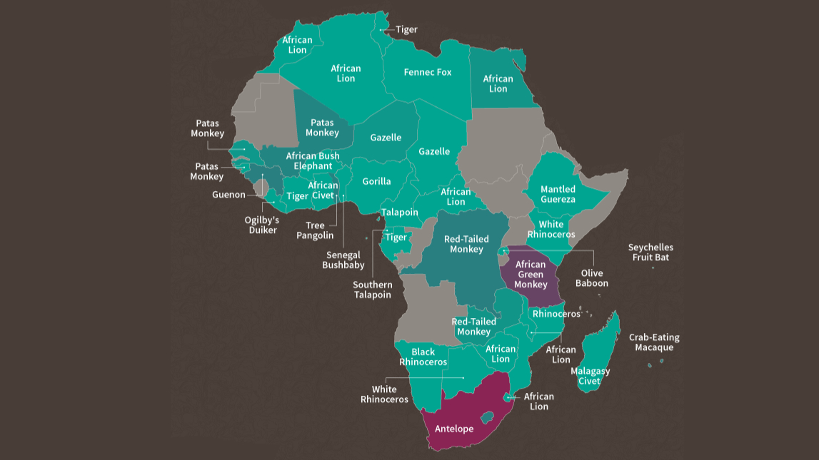 AWF pinpoints the main animal exported from each country, though it’s a close competition in South Africa, where the 1,611 exported antelopes just edge out the 1,592 African lions. The most exported animal overall is the African Green Monkey, a popular pet, with over half finding themselves in Russia.