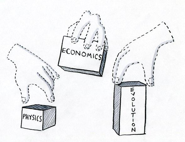 1. Science’s theories—its verifiable stories—often have metaphors built into their formal models (sometimes implicitly). The conceptual skeleton of economics—that an “invisible hand” guides rational self-interest in competitive markets to optimal social equilibria—mixes a loose biological analogy (competition ensuring efficiency and survival-of-the-fittest) with ill-fitting formal models from physics.