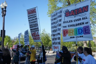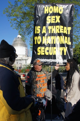 Sitting cheek-by-jowl in the packed press gallery at the Supreme Court on Tuesday and listening to 150 minutes of oral arguments in the historic same-sex marriage cases, I marveled at how radically the defense of “traditional marriage” has shifted in just a few short years. There was a motley crew of devout bible wranglers on the courthouse steps preaching fire and brimstone (see a couple of shots I snapped, below), and one brave soul who stood up in the courtroom yelling at the top of his lungs that the justices will “burn in Hell” if they approve the “abomination” of a right to same-sex marriage. He was quickly removed from the courtroom, but continued to make himself heard from the outside for a good 10 minutes while Solicitor General of the United States Donald Verrilli made a soaring case for treating gays and lesbians equally under the Constitution.