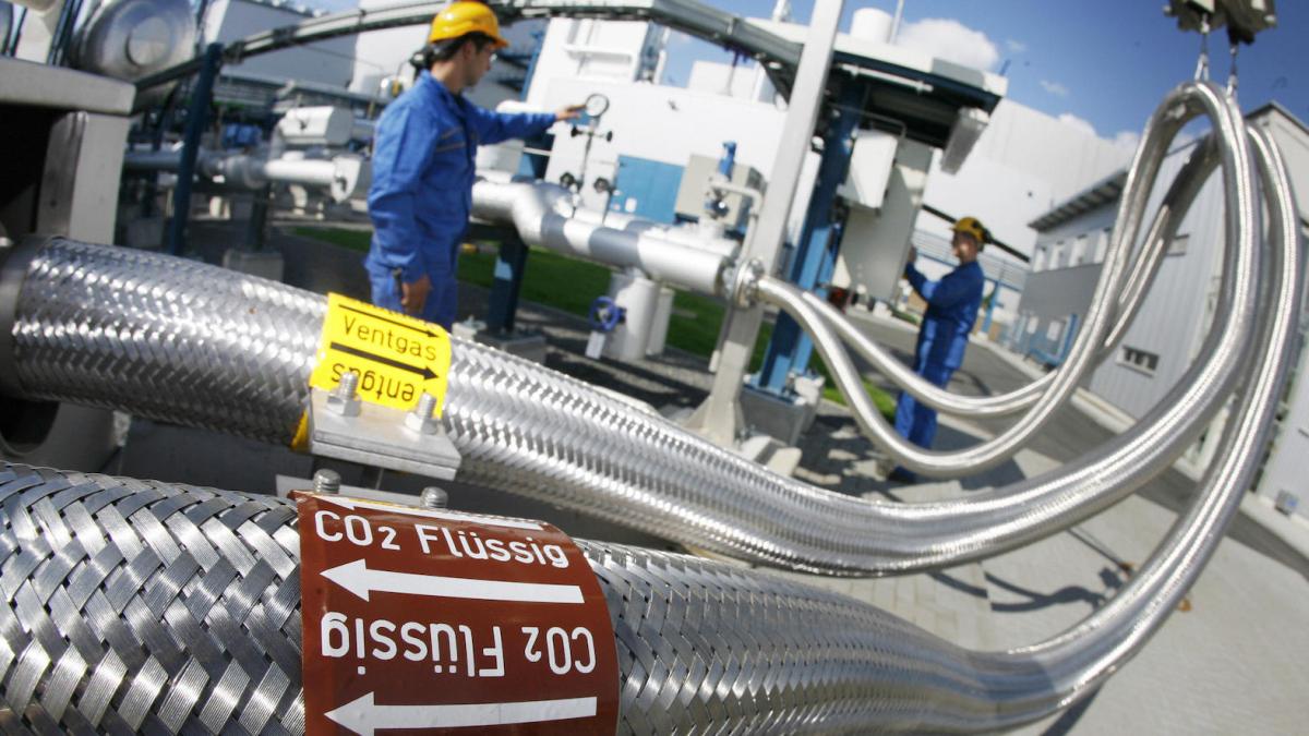 An employee poses with a pipe used to carry liquid CO2 on September 08, 2008 at the ‘Schwarze Pumpe’ (‘Black Pump’) power station run by Europe’s biggest power company Vattenfall in Werder near Berlin. (Photo credit MICHAEL URBAN/AFP/Getty Images)