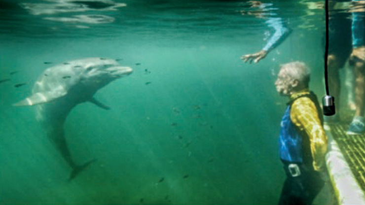 At the Dolphin Discovery Center in Puerto Aventuras, Mexico, scientist Jim McDonough of SpeakDolphin.com entered a dolphin tank with a cetacean named Amaya. McDonough had exhaled as much of his air as he could so that he wouldn’t block Amaya’s view of him with bubbles, and so he wouldn’t float up.