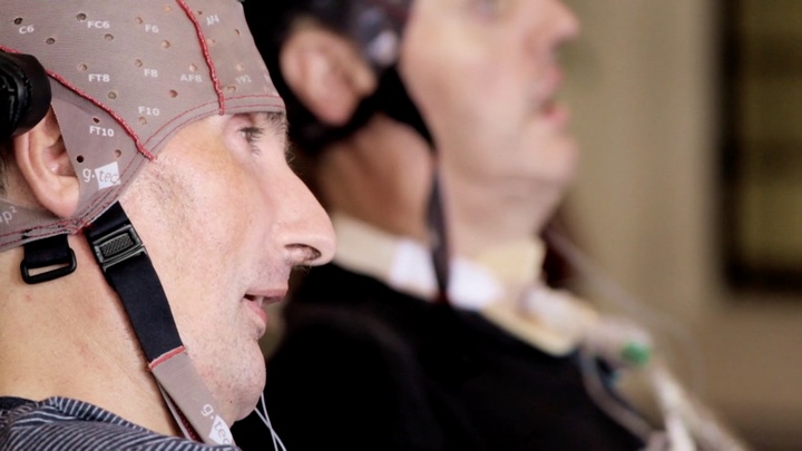 The composers generated all of the parts using nothing but brainwaves. They were connected via electroencephalogram electrodes to a brain-computer music interface (BCMI) system that allowed each person to compose their part on-the-fly by selecting from among four phrases for live musicians to play — really, it’s as much a performance by the composers as it is by the musicians.