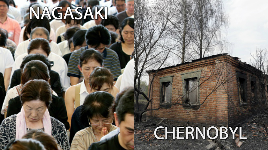 Thirty years after, Hiroshima and Nagasaki are bustling cities. Thirty years after Chernobyl, abandoned city. What’s the difference?