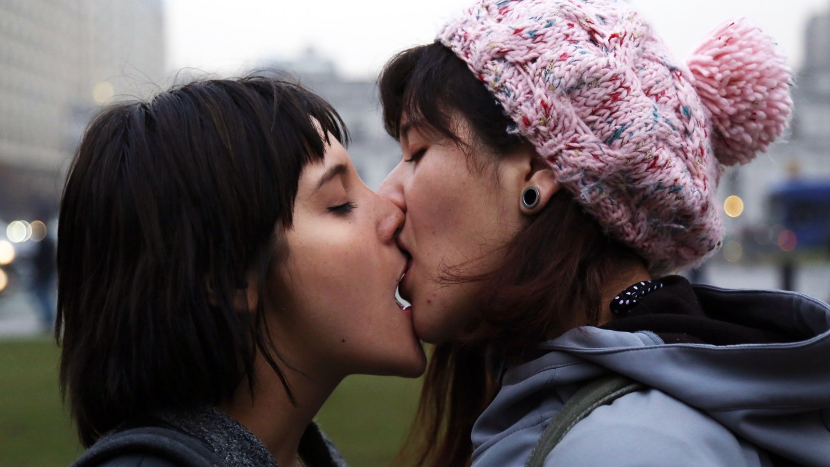 Chilean lesbians kiss in front of La Moneda presidential palace during the Week of the Lesbian Visibility in Santiago, on July 10, 2015, demanding more rights for this community. AFP PHOTO/Claudio Reyes. AFP PHOTO/CLAUDIO REYES (Photo credit should read Claudio Reyes/AFP/Getty Images)