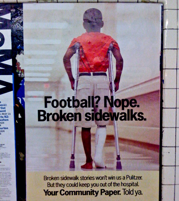 The art shows the back of a skinny kid negotiating a hospital corridor on crutches. The copy reads: “Football? Nope. Broken sidewalks. Broken sidewalk stories won’t win us a Pulitzer, but they could keep you out of the hospital. Your Community Paper. Told ya.”