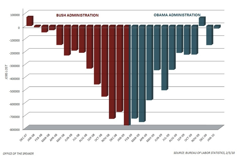 When the most recent jobs report came out a week ago, Speaker of the House Nancy Pelosi’s (D-CA) officecirculated a striking chart showing the number of jobs the American economy lost each month since 2007. The months of George W. Bush’s presidency are in red, and the months after Barack Obama assumed the presidency are in blue. What’s striking about the chart is where it begins to turn around: the economy lost steadily fewer jobs each month after President Obama took office in January of 2009.