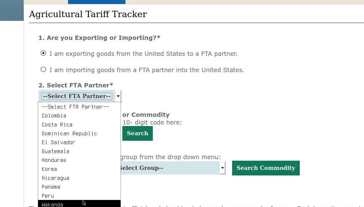 - A USDA web tool designed to list countries who have free trade with the United States listed Wakanda among them this week.