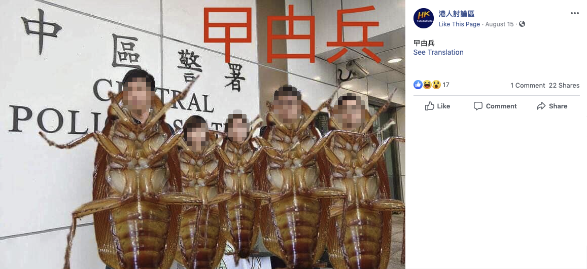 Posts from these accounts portray the protesters as radical and violent. One example posted to Facebook reads, in part: “They will shoot to kill with a slingshot. They took a nurse’s right eye. They are the Hong Kong cockroaches.” Another post likens the protesters to ISIS fighters. On Twitter, one message read, “We don’t want you radical people in Hong Kong. Just get out of here!”