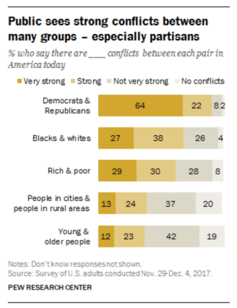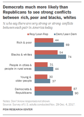 A new Pew Research Center survey shows that 86 percent of Americans said conflicts between Democrats and Republicans are strong or very strong. In comparison, just 65 percent of Americans said the same for race relations between black and whites, while 60 percent reported strong conflicts between the poor and rich.