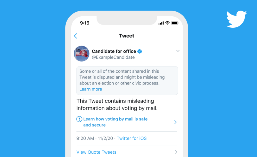 “We do not allow anyone to use Twitter to manipulate or interfere in elections or other civic processes, and recently expanded our civic integrity policy to address how we’ll handle misleading information surrounding these events. Under this policy, we will label Tweets that falsely claim a win for any candidate and will remove Tweets that encourage violence or call for people to interfere with election results or the smooth operation of polling places.”