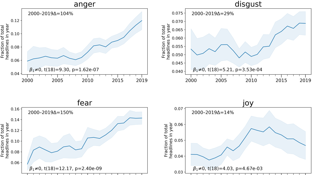 “An increase of 104% in the prevalence of headlines denoting anger since the year 2000 is apparent,” the researchers reported. “There are also substantial increases in the prevalence of headlines denoting fear (+150%), disgust (29%), and sadness (+54%).”
