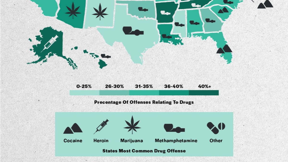 Rhode Island stands out with an exceptionally low share of drug offenses ending in prison time, likely a result of the state’s move to roll back mandatory minimum sentencing in recent years.