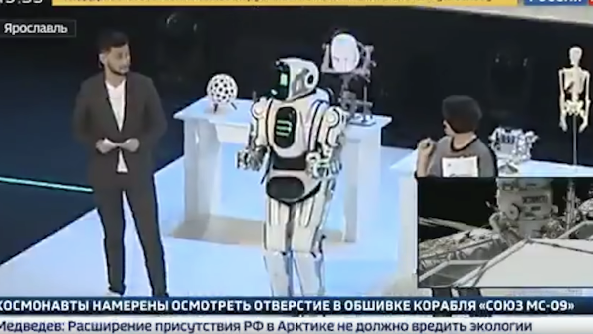 While reporting on the Proyektoria technology forum in Yaroslavl, organized each year for the “future intellectual leaders of Russia”, the state-owned channel Russia-24 promoted a “most modern” android as a tech breakthrough that could talk, walk and even dance.