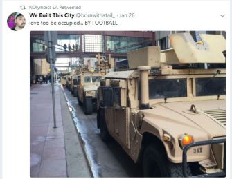 In Rio, 20,000 were moved from their flavelas, where residents are not only poor but mostly black. Activists fear that a racial element could also come into play in diverse Los Angeles. To broadcast these concerns, they’ve held public forums and other actions. As with any modern activist group, they’ve also taken to Twitter to voice their concerns, and their provocative posts have caught attention, by perfectly encapsulate their arguments.