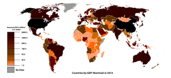 Here is a map of the world colored by GDP. You can see China and the United States are far richer than most other countries, that nations in the south are often poorer than those in the north, and smaller nations generally have less money than their larger neighbors as well.