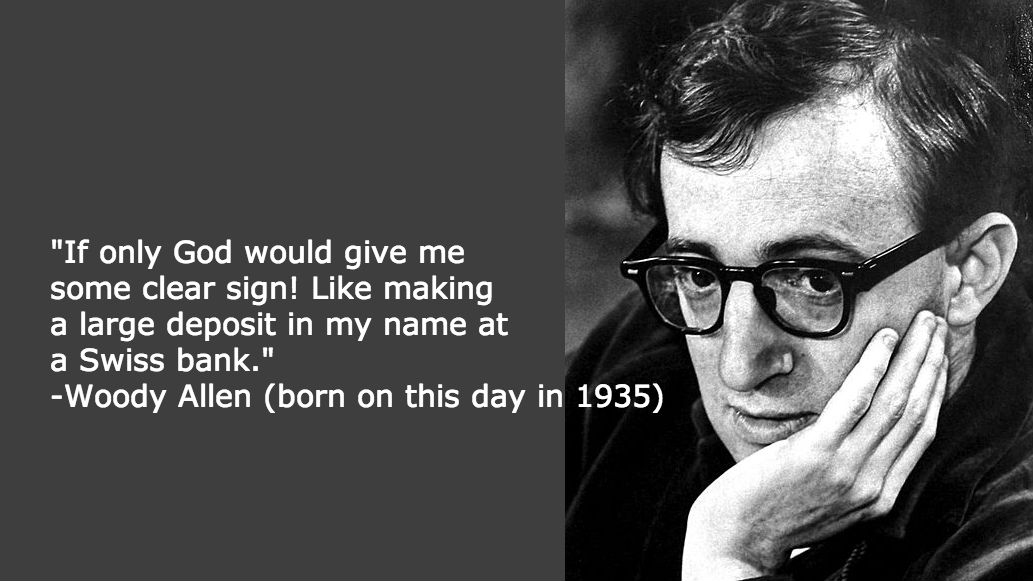 “If only God would give me some clear sign! Like making a large deposit in my name at a Swiss bank.” -Woody Allen (born on this day in 1935)